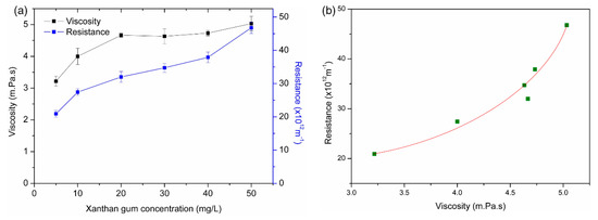 (a) The viscosities of xanthan gum solutions and the total filtration resistances of xanthan gum caused after filtration tests; (b) The relationship between filtration resistance and viscosities of xanthan gum solutions.