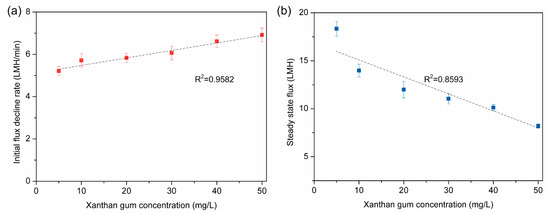 The changes of (a) the initial fouling rate and (b) final flux at the steady stage with increasing the concentration of xanthan gum.
