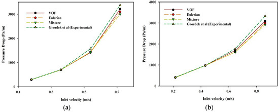 Although the numerical models yield reasonable estimation of pressure drop under all flow conditions and relative errors are close to ~15% as depicted in Figure 6a–c, at particular volumetric loading, with the increase in velocity, the accuracy of numerical models gradually declined. Moreover, it is noted in Figure 6a,b, that in the low-velocity region, the experimental values of pressure drop increases faster than the numerical predictions. This can be well explained by the fact that that when ice slurry flows in a low-velocity region, the pressure drop increases due to the increase in ice particles buoyancy, which results an increased friction among the ice particles and the pipe wall [35,49].
