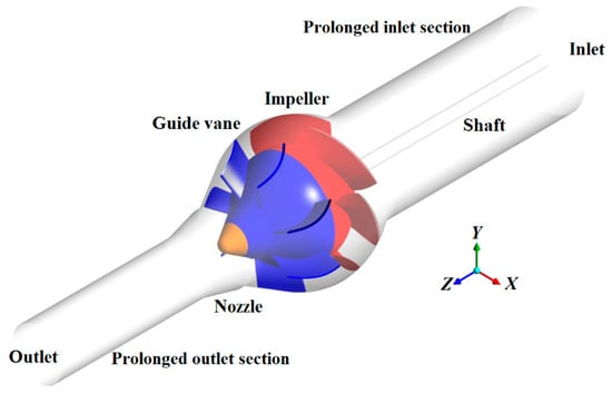 A computational domain geometric model including the nozzle is established to obtain stable flow field data of the mixed-flow waterjet propulsion device. Along the flow direction, subdomains are the prolonged inlet section, the inlet transition section, the impeller, the guide vane (GV), the nozzle, and the prolonged outlet section, as shown in Figure 1.