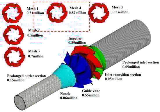 According to the geometrical characteristics of each sub-domain, different meshing strategies are employed to construct the discrete meshes of each sub-domain. The impeller, the GV and the nozzle adopt the J-type, H-type, and O-type meshing methods, separately. By using ANSYS-ICEM, a reasonable block structure for each sub-domain is created to generate the number of structured meshes by controlling the number of mesh nodes and the growth rate. The accuracy of the calculation results will be poor if the meshes do not meet the calculation requirements. However, if the number of meshes is too large, it will occupy numerous computing resources. Therefore, the mesh independence analysis needs to be performed. The number of impeller meshes is 0.31 million, 0.5 million, 0.7 million, 0.89 million, and 1.1 million, recorded as mesh 1–5, as shown in Figure 2.