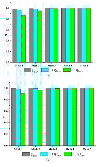 Mesh independence analysis. (a) Histogram of H’ for each mesh at QBEP, 1.13 QBEP, and 1.33 QBEP. The relative head H’ of mesh 4 tends to be constant. (b) Histogram of η’ for each mesh at QBEP, 1.13 QBEP, and 1.33 QBEP. The relative head η’ of mesh 4 tends to be constant.
