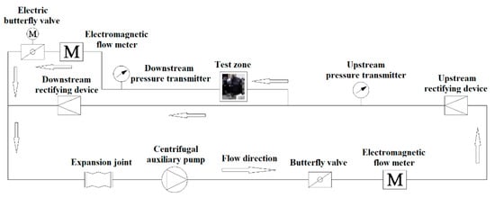 As shown in Figure 5, double cycle waterjet propulsion test bench is established to verify the reliability of the numerical simulation method. The test device consists of two cycles—the main cycle and the secondary cycle. The main cycle, which is applied to provide the navigation speed for the waterjet propulsion pump, consists of the centrifugal auxiliary pump, electromagnetic flow meter, butterfly valve, expansion joint, rectifying device, and piping system. The secondary cycle, which is used to test the hydraulic performance, includes the test zone (mixed pump), electromagnetic flow meter, butterfly valve, and piping system. The flow rate is measured by the flow meter located in the main cycle and secondary cycle. The head is obtained by calculating the pressure measured at the beginning of the inlet flow tube and the outlet pressure measuring tube. The shaft power is calculated from the test data of the torque meter. The comprehensive error of this test bench is ±1.33%.