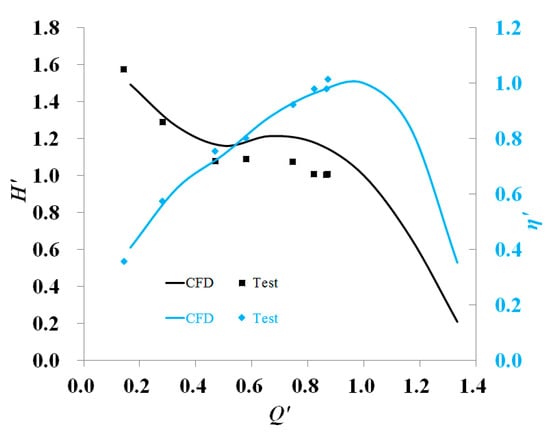 Numerical simulation and model test are carried out when the rotational speed is 400 rev/min. Dimensionless head H’ and efficiency η’ are obtained by dividing the head and efficiency of the best efficiency point, plotted in Figure 6. The CFD result shows a consistent trend with the test result. Therefore, the numerical method is reliable and suitable for the following research work.