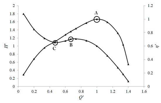 By diving the flow rate, head, and efficiency of the best efficiency point, dimensionless processing is performed for each condition. The dimensionless data is plotted into dimensionless a ‘flow rate-head’ curve and dimensionless ‘flow rate-efficiency’ curve, shown in Figure 7, in which the abscissa is Q’, the left ordinate, is H’ and the right ordinate is η’. The best efficiency point is marked as condition A. Under the condition B, the propulsion pump enters the hydraulic unstable zone. Condition C is the valley point of the hydraulic unstable zone.