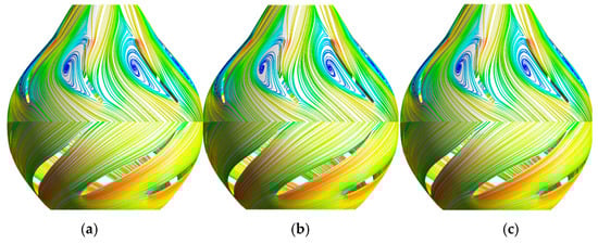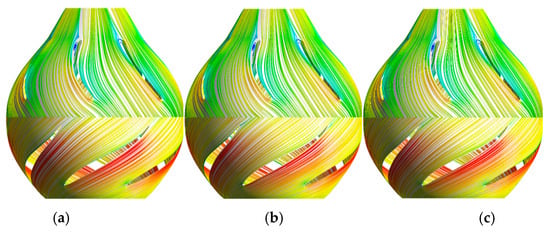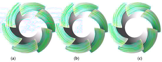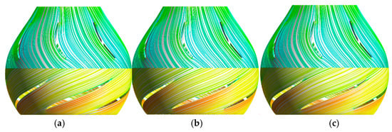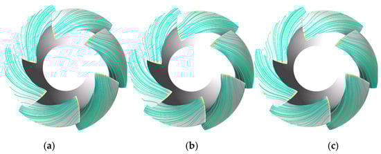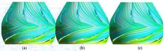 Streamlines on the turbo surface TS3 of condition A (best efficiency point). (a) 0. (b) 1/3T. (c) 2/3T.