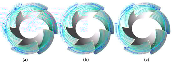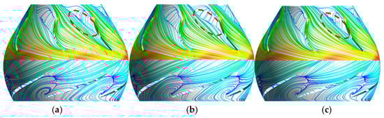 Streamlines on the turbo surface TS2 of condition A (best efficiency point). (a) 0. (b) 1/3T. (c) 2/3T.