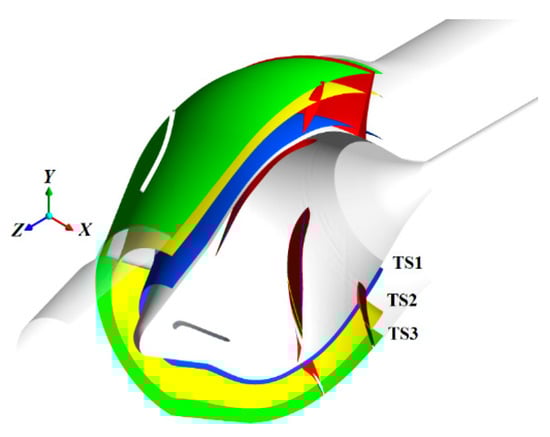 Three turbo surfaces from the hub to the shroud are sliced and recorded as TS1 (span = 0.1) near the hub, TS2 (span = 0.65) near the intermediate surface, and TS3 (span = 0.96) near the shroud, as shown in Figure 11.