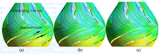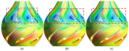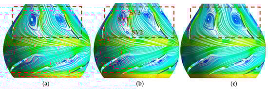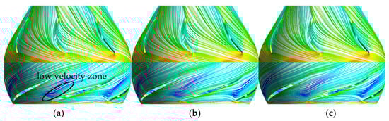 Streamline on the blade of different times for condition A (best efficiency point). (a) 0. (b) 1/3T. (c) 2/3T.