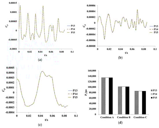 Pressure pulsation time domain diagram and pressure pulsation amplitude (P13–P15). (a) Condition A (best efficiency point). (b) Condition B (start point of hydraulic unstable zone). (c) Condition C (valley point of hydraulic unstable zone). (d) Pressure pulsation amplitude.
