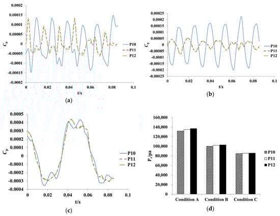 Pressure pulsation time domain diagram and pressure pulsation amplitude (P10–P12). (a) Condition A (best efficiency point). (b) Condition B (start point of hydraulic unstable zone). (c) Condition C (valley point of hydraulic unstable zone). (d) Pressure pulsation amplitude.