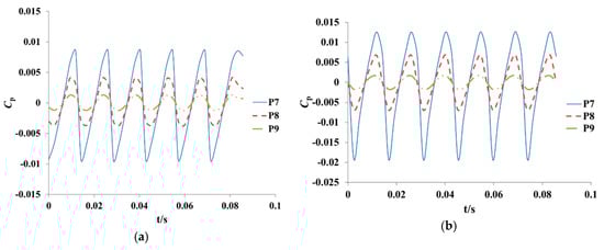 The pressure pulsation time domain diagram and comparison of pressure pulsation amplitude of the monitoring probes P7–P9 in a period under different conditions is shown in Figure 23. The main frequency, the secondary frequency and the corresponding pressure amplitude of the monitoring probes P7–P9 under different conditions are listed in Table 4.