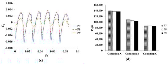 Pressure pulsation time domain diagram and pressure pulsation amplitude (P7–P9). (a) Condition A (best efficiency point). (b) Condition B (start point of hydraulic unstable zone). (c) Condition C (valley point of hydraulic unstable zone). (d) Pressure pulsation amplitude.