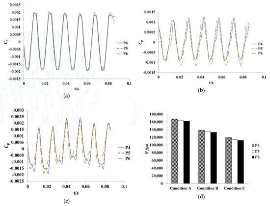 Pressure pulsation time domain diagram and pressure pulsation amplitude (P4–P6). (a) Condition A (best efficiency point). (b) Condition B (start point of hydraulic unstable zone). (c) Condition C (valley point of hydraulic unstable zone). (d) Pressure pulsation amplitude.