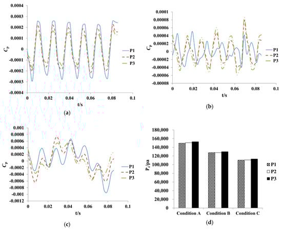 Pressure pulsation time domain diagram and pressure pulsation amplitude (P1–P3). (a) Condition A (best efficiency point). (b) Condition B (valley point of hydraulic unstable zone). (c) Condition C (valley point of hydraulic unstable zone). (d) Pressure pulsation amplitude.