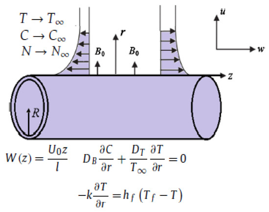 We assume a two-dimensional radiative flow of Oldroyd-B fluid with addition of nanoparticles over a stretched cylinder of radius R . Following the cylindrical polar coordinates ( r , z ) , the r axis is taken in the radial direction while z axis is assumed along the cylinder axis. The effects of magnetic fields are utilized in r axis. Owing to the smaller Reynolds number assumptions, the induced magnetic field effects are ignored (see Figure 1). Let T, C , and N denotes the nanoparticles’ temperature, concentration, and microorganism, respectively. The nanoparticles concentration and motile organisms near the surface are expressed with C w and N w , respectively. Further, far away from the surface, the nanoparticles concentration is symbolized by C and motile microorganisms is expressed by N .