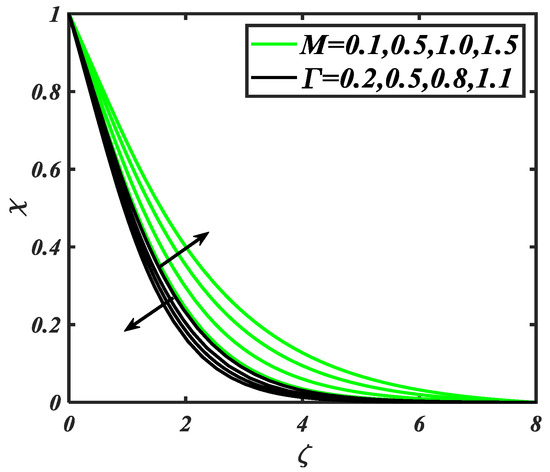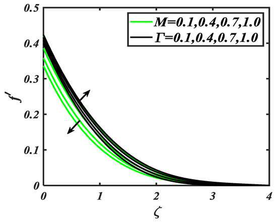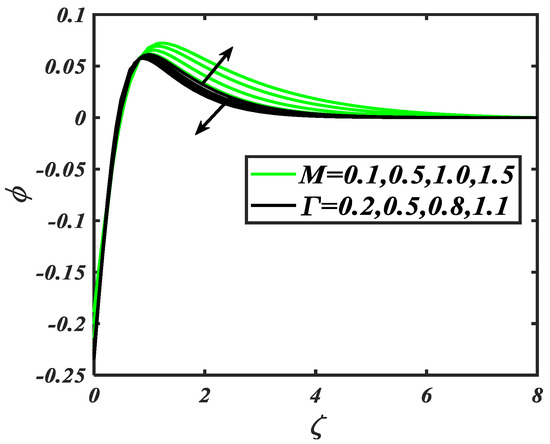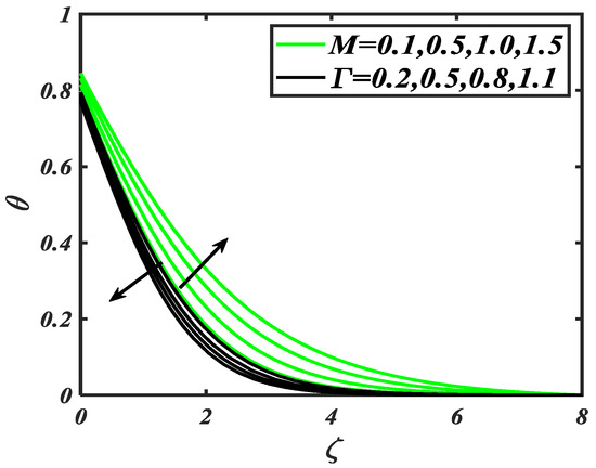 In order to examine the fluctuation in nanoparticle temperature θ against different values of Hartmann number M and mix convection parameter Γ , Figure 5 is presented. While observing the variation in θ with M , an improved nanoparticle temperature is originated due to the evaluation of Lorentz force. The implementation of a strong magnetic force slightly enhanced the nanoparticles’ temperature and concerned boundary layer. However, quite opposite observations were being found due to the alteration of Γ . The mixed convection parameter is usually related to the Grashoff number which boosts up nanoparticle temperature efficiently.