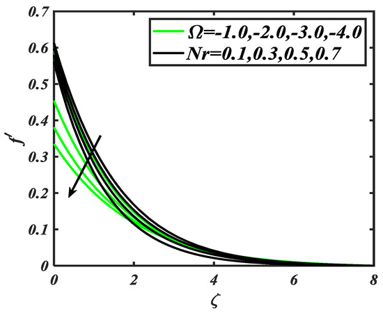 After successfully computing the numerical simulation [45,46,47,48,49,50,51,52], now we examine the flow mechanism of various engineering parameters like constant curvature parameter α , Deborah number in terms of relaxation time β 1 , Deborah number in terms of retardation time β 2 , Hartmann number M , mixed convection parameter Γ , Rayleigh number N c , buoyancy ratio constant N r , thermophoresis parameter N t , Brownian motion N b , thermal radiation parameter R , Prandtl number Pr , Lewis number L e , Biot number γ , Peclet constant P e , Lewis number L b , bioconvection constant Ω 1 , first order slip constant ω and second order slip parameter Ω on the distribution of velocity f , temperature θ , concentration ϕ and motile microorganisms χ . Following to the traditional theoretical scientific contributions for similar analysis, we have allocated some fixed value to each physical parameter like α = 0.1 , β 1 = 0.2 , β 2 = 0.1 , M = 0.5 , Γ = 0.2 , N c = 0.2 , N r = 0.3 , N t = 0.4 , N b = 0.4 , R = 0.6 , Pr = 0.71 , L e = 0.3 , γ = 0.3 , P e = 0.2 , L b = 0.4 , Ω 1 = 0.1 , ω = 0.2 and Ω = 0.3 . It is remarked that for present flow problem, the viscosity of fluid is assumed to be constant and all the graphical analysis has been performed with this fact for all parameters. The physical illustration of Hartmann number M and mixed convection parameter Γ on f has been visualized in Figure 2. The velocity distribution truncated with M as being an interaction of Lorentz force which is of resistive nature and subsequently reduced the movement of fluid particles. On contrary, an enhanced distribution of f has been observed for leading values of Γ . The graphical computations are performed in Figure 3 which deals with the impact first order slip parameter Ω and buoyancy ratio parameter N r on f . With variation of N r , the alteration in f shows a decreasing trend due to presence of buoyancy forces which retarded the movement of fluid particles effectively. Similarly, the presence of the slip factor also declined the velocity of the particles near the surface. Figure 4 depicts the variation for the progressive values of Rayleigh number N c and second order slip factor ω on velocity distribution f . With variation of both parameters, a decrement in the velocity distribution is observed. With utilization of second order slip consequences also leads to being a depressed velocity profile.