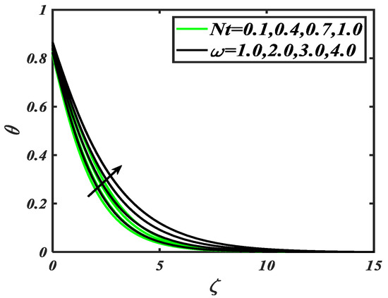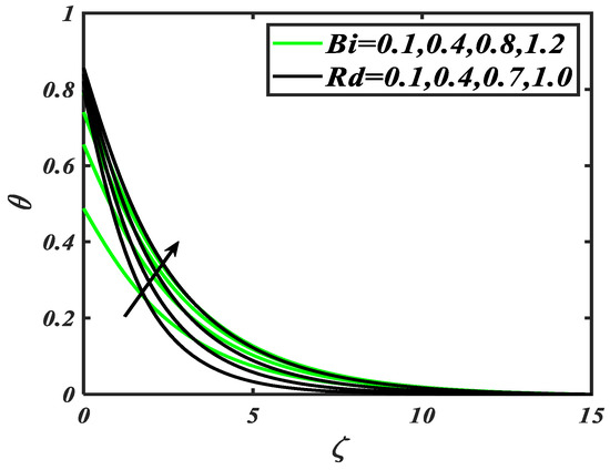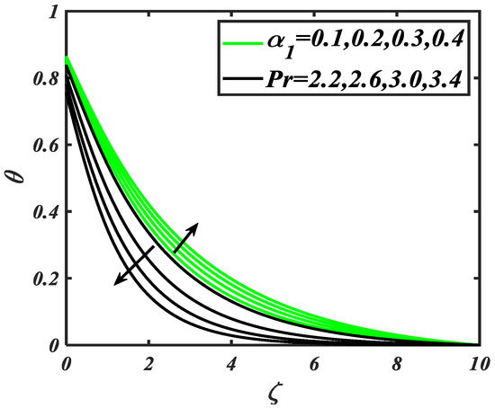 Figure 6 intrigued the influence of the thermophoresis parameter N t and first order slip parameter ω on θ . A progressive nanoparticles distribution was observed for N t . However, change in nanoparticle temperature was quite minimal due to the occurrence of smaller temperature difference. Physically, thermophoresis process was a migration of fluid particles from the hot configuration to the relatively cold region. Due to such fluctuation of nanoparticles, temperature profile enhanced. Another interesting observation examined for the variation of the slip constant reveals that the presence of the slip parameter also played a collective role in the enhancement of thermo-physical systems. Figure 7 designed the envision of nanoparticle temperature θ for leading values of curvature parameter α 1 and Prandtl number P r . With increasing α 1 , distribution of θ enlarged maximum values. The variation in θ , due to existing values of Pr , controled the nanoparticles’ temperature as P r attained inverse relation with thermal diffusivity. The variation in thermal diffusivity becomes slower as P r gets maximum values. The graphical explorations are portrayed in Figure 8 to depress the impact of Biot number B i and Radiation parameter R d on θ . A boosting nanoparticles temperature has been examined with involvement of R d . Physically, the enrolment of radiation parameter provided extra heat to the nanoparticles’ temperature due to which temperature increases. While observing the role of thermal Biot number B i . on θ , we note that an upshot of nanoparticles was exhibited due to large B i . The physical justification behind such a trend was justified as B i , directly related to the coefficient of heat transfer which results in an increased temperature distribution. Moreover, more heat is transmuted from the hot surface to cold region particles which raise the temperature distribution.