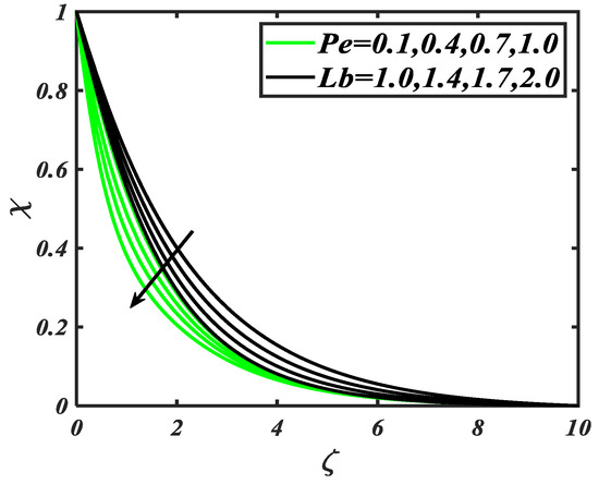 The variation in X for various values of Hartmann number M mixed convection parameter Γ Peclet number Pe and bioconvection Lewis number Lb has been inspected in Figure 13 and Figure 14. Figure 13 deals with the variation of Hartmann number M and mixed convection parameter Γ on motile density profile χ The motile organism profile sufficiently improved with M however, a decrement in χ has been noted for Γ To determine the effects of Peclet number Pe and bioconvection Lewis number Lb on motile microorganism distribution χ, Figure 14 is sketched. The maximum values of Pe results decrement of microorganisms diffusivity and so X declined. Moreover, it can be also observed that increasing values of bioconvection Lewis number Lb also causes lower motile microorganism distribution X.