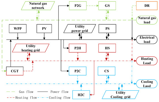 In recent years, environmental pollution and the current depletion of fossil energy have become more and more serious. The energy structure should be transformed and upgraded urgently. It is the current trend of the energy field to pursue the efficient use, clean environmental protection, and sustainable development of energy [1]. As a further extension of micro power grids, a micro energy grid could realize the coordinated planning and unified scheduling of multiple energy sources (electricity, heat, cold, and gas, etc.) through new energy technologies and internet technologies, which could effectively improve energy efficiency while achieving local production and consumption of energy [2]. The China Development and Reform Commission also put forward the Guiding Opinions on the Development of “Internet + Promoting” Intelligent Energy, pointing out that it is essential to strengthen the construction of multi-energy synergistic integrated energy networks, and the coupling interactions and comprehensive utilization of different energy types, such as electricity, gas, heating, and cooling [3].