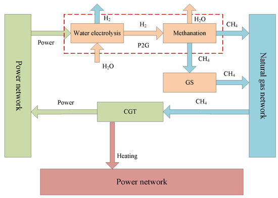 P2G can utilize the curtailment output of WPP and PV to convert CO2 into CH4, which realizes the interconnection of the power grid and gas network. P2G is divided into two processes: electrolysis and methanation. Electrolysis uses excess electricity to generate hydrogen by electrolyzing water and injecting it into the natural gas pipeline or a storage device. On the basis of electrolysis, the methanation process uses the hydrogen to react with carbon dioxide to form methane and water under the action of a catalyst. Figure 2 shows the technical principles of P2G-GS operation.