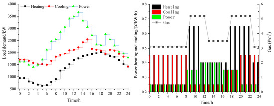 The Xinxiang Active Distribution Network Demonstration Project includes 1000 kW PV, 800 kW WPP, and 2000 kW CGT. The cost parameters of CGT operation were selected according to reference [21]. In order to facilitate the model solution, the CGT operation cost function was divided into two stages, and the slope coefficients were 0.55 ¥/kW and 0.15 ¥/kW, respectively. In order to meet the demand of the multi-energy load of electricity, heat and cold, the demonstration project was equipped with P2H 1500 kW, P2C 1000 kW, H2C 1500 kW, and P2G 150 kW. The maximum energy storage and release power of PS and HS in this demonstration project was 200 kW and 300 kW, the storage capacity was 1000 kW h, the maximum energy storage and release power under CS was 300 kW, and the energy storage capacity was 1000 kW/h. In addition, the demonstration project was equipped with a 500 m3 gas storage tank, and the maximum gas storage and supply power were both 150 kW. The energy efficiency of the different energy equipment was 96%. Considering that CGT operation can generate carbon emissions, this paper took 85% of the total carbon emissions from MEG operation as the MTEA, and chose a different energy load demand and real-time price of a typical load day as the basic data of the energy supply. Figure 3 is the electricity, heating, cooling, and gas load demand on a typical load day.