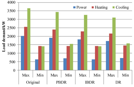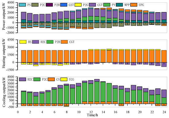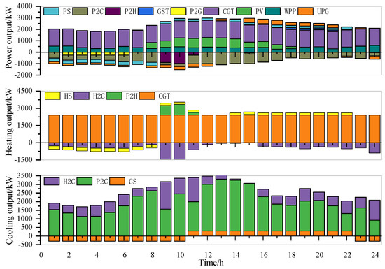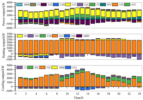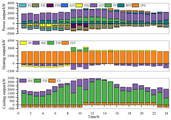 Finally, in order to analyze the optimal effect of the demand response of MEG operation, peak, flat, and valley periods of different load types of electricity, heating, and cooling were divided according to reference [21], and corresponding time-of-use (TOU) prices were set. Among them, the peak period price increased by 25%, the valley period price decreased by 25%, and the flat period price remained unchanged. The price elasticity of electricity, heating, and cooling was selected according to reference [21]. For the incentive demand response, the up-rotating reserve price and the down-rotating reserve price of the electricity, heating and cooling reserve markets were 0.85 ¥/kW·h and 0.25 ¥/kW·h, 0.55 ¥/kW·h and 0.15 ¥/kW·h, and 0.45 ¥/kW·h and 0.15 ¥/kW·h, respectively. To avoid an excessive response of PBDR and IBDR, which would result in a “peak-to-valley upside down” phenomenon of the load curve, the total output of PBDR and IBDR should not exceed 10%, and the output power should not exceed 100 kW.