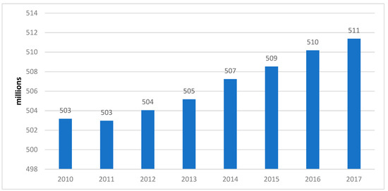 As can be seen in Figure 4, the population in European Union countries rose from 511 million in 2010 to 511 million in 2017, which represents a 1.6 increase in the analyzed period.