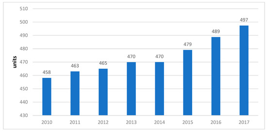 Average passenger cars per 1000 inhabitants in European Union countries from 2010 to 2017. Source: Eurostat [26].