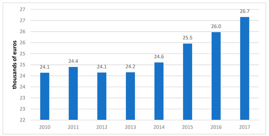 Average GDP per capita in European Union countries (in thousands of euros) between 2010 and 2017. Source: Eurostat [26].