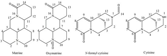 - Ohmiya, S.; Otomas, H.; Murakoshi, I.; Haginiwa, J. N-formylcytisine: A new alkaloid from thermopsis chinensis. Phytochemistry 1974, 13, 643–644. [Google Scholar] [CrossRef]