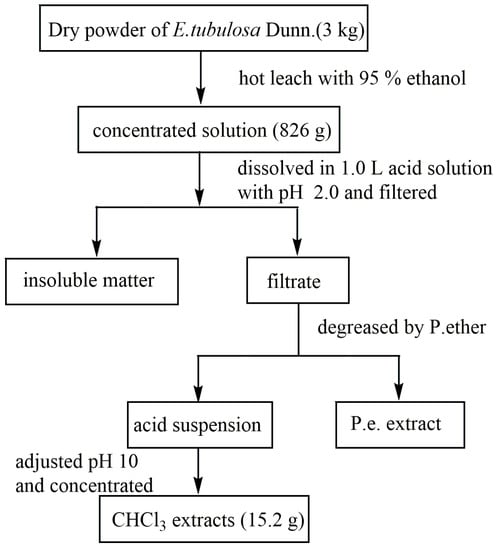 The root and stem of E. tubulosa Dunn., identified by Ai-Wen Dong, research fellow, Hunan Key Laboratory of Forest Chemical Engineering, Jishou University, were collected from Tianping Mountain Reserve of Badagongshan National Forest Park in Hunan Province. Analytical carbon tetrachloride (≥99.5%), dichloromethane (≥99.5%), n-butanol (≥99%), methanol (≥99.5%), chloroform (≥99%), ammonia water (25% to 28%), hydrochloric acid (36% to 38%), triethylamine (≥99%), ethanol (95%), petroleum ether (60–90 °C) and chromatographic methanol (99.9%) were purchased in Shanghai TAITAN Technology Co., Ltd., Shanghai, China. Water was distilled water made in laboratory. Silica gel and GF254 plates were purchased in Qingdao Marine Chemical, Inc., China.