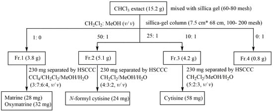In the experiment, the powder of Euchresta tubulosa Dunn. was extracted by hot reflux method. The total alkaloid was degreased by petroleum ether and enriched by chloroform extraction. The flow chart of alkaloid preparation is shown in Figure 2. The total alkaloid was preliminarily separated into four components by silica gel column chromatography using gradient elution. The alkaloid with high relative content in each component was separated by HSCCC. The flow chart of systematic separation is shown in Figure 3.