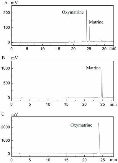 The root and stem of Euchresta tubulosa Dunn. were ground into dry powder by high speed multifunctional grinder (YB-1250A, Zhejiang Yongkang Sufeng industry and Trade Co., Ltd., Zhejiang, China) and screened through a 60-mesh sieve. The dry powder (3 kg) was extracted by 95% ethanol hot reflux for three times with the ratio of material to liquid of 1: 6 (g: mL), each time for three hours, and the fixed temperature of water bath was 80 °C. After filtration, extract (826 g) was obtained by 55 °C rotary evaporation. Dilute hydrochloric acid and distilled water were used to prepare acid solution with pH 2.0, and the extract was dissolved with 1.0 L acid solution, filtered and degreased with petroleum ether. Then the pH of the solution was adjusted to 10 with ammonia water. Finally, the solution was extracted with chloroform at the ratio of 1:1 (v/v) until chloroform layer and bismuth potassium iodide had almost no precipitation reaction. The chloroform extract was concentrated and dried at 40 °C to obtain total alkaloid (15.2 g), which were preserved at low temperature for later separation and purification.