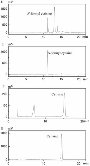 For the separation of component 3, dichloromethane/methanol/water was used as the two-phase solvent system for HSCCC. According to HPLC-UV analysis, two compounds with high content were identified as target compounds. According to the relevant HSCCC separation conditions, the instrument was debugged. The retention rate of stationary phase was 70% and one purified peak was obtained, marked as peak 4 in Figure 4C. It was identified as cytisine. The purity of other compounds for further purification was less than 80%. The residual liquid in the column was blown out by nitrogen gas and concentrated for subsequent separation and purification.