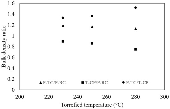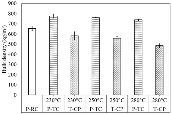 The bulk density of P-RC, P-TC, and T-CP at various torrefied temperatures.