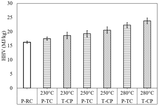 The higher heating value of P-RC, P-TC, and T-CP at various torrefied temperatures.