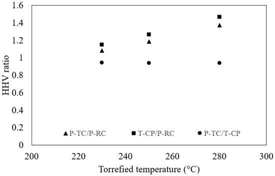 The HHV ratio of P-RC, P-TC, and T-CP.