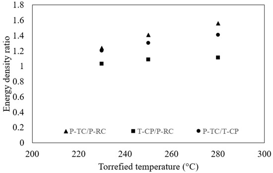 At torrefied temperatures of 230, 250, and 280 °C, the energy density of T-CP was 10.92, 11.50, and 11.77 GJ/m3, respectively, while that of P-TC was 13.13, 14.97, and 16.55 GJ/m3, respectively. The energy density of P-RC was 10.62 GJ/m3 (Figure 5). The energy density of P-TC was highest, while energy density of T-CP was slightly higher than that of P-RC. The energy density of P-TC was 1.24–1.56 and 1.20–1.41 times higher than that of P-RC and T-CP, respectively (Figure 6). The energy density was generally used to evaluate logistic cost of fuel. The higher energy density led to a lower logistic cost. The result indicated that P-TC was the most suitable form in terms of logistic. Although energy density of T-CP was comparable to P-RC, T-CP might be more suitable than P-RC due to the higher HHV of T-CP.
