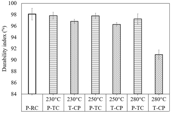 The durability index of P-RC, P-TC, and T-CP at various torrefied temperatures.