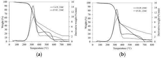 Pyrolysis process of P-TC and T-C. (a) Torrefied temperature of 230 °C. (b) Torrefied temperature of 250 °C.