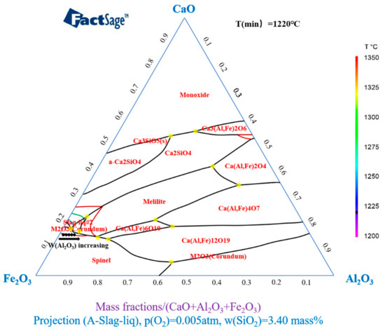 The isothermal liquids at 1200–1350 °C with different Al2O3 content were calculated by FactSage 7.0 software. The partial pressure of oxygen was fixed at 5 × 10−3 atm and the content of SiO2 was fixed at 3.40 wt %. The calculation results are shown in Figure 2. The chemical compositions of the samples according to the different Al2O3 contents in Table 1 are indicated by black dots in the figure.