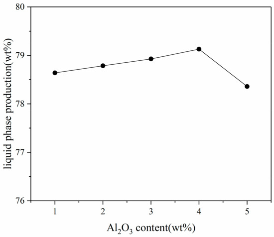 The calculation results show that as the Al2O3 content in iron ore fines increased, the amount of the liquid phase formation increased slightly, which is consistent with the conclusions of other researchers [10,20,21]. However, once the Al2O3 content in the iron ore fines reached 4.0 wt %, as the Al2O3 content continued to increase, the liquid phase production began to decrease. Combined with the phase diagram analysis, it was observed that when the Al2O3 content reached 5.0 wt %, the possibility of the presence of spinel in the sample was greatly increased, resulting in a decreased amount of the liquid phase. In general, the change in Al2O3 content has little effect on the amount of the liquid phase formation based on the thermodynamic liquid phase results.