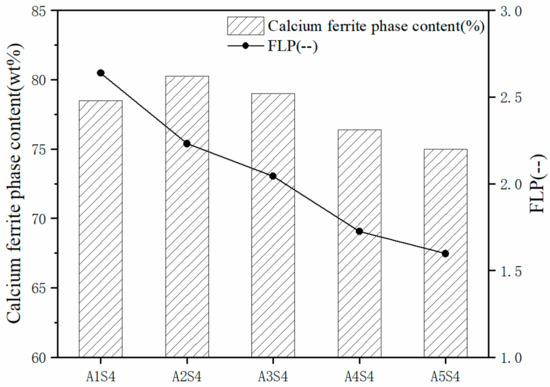 The K-valued XRD (Rigaku, Tokyo, Japan) was used to quantitatively analyze the trend of calcium ferrite mineral content under different Al2O3 contents, and the results are shown in Figure 5.