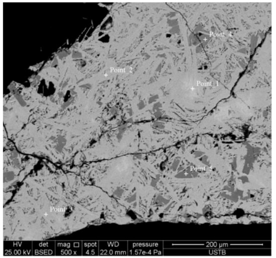The A5S4 sample was taken as an example to study this phenomenon. Figure 6 shows the backscattered electron image of the A5S4 sample. The results of the energy spectrum analysis are shown in Table 2.