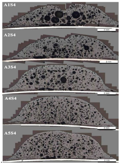 According to Figure 7, the consolidation strength of the sintered body composed of different Al2O3 content adhesion powders increased slightly initially; when the Al2O3 content exceeded 2 wt %, the consolidation strength of the sintered body began to decrease [1,7]. The results of the liquid phase fluidity index of different Al2O3 content adhesive powders show that with the increased Al2O3 content, the liquidity of the sample liquid phase decreased continuously. This rule is consistent with the case where the Al2O3 content is greater than 2 wt %. In the same manner, this is also caused by insufficient adhesion between the quasiparticles after the liquidity of the liquid phase is reduced. For the A1S4 sample, our analysis is that the liquid phase fluidity was too high, causing the microporous, thin-wall structure of the binder phase. Figure 8 shows the pore structure of the different Al2O3 content adhesion powders.