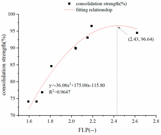 Fitting relationship between liquid phase fluidity and consolidation strength of samples with different gangue contents.