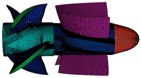 The emergency drainage pump studied in this paper is mainly used in urban emergency drainage projects. Its compact structure makes it convenient to be transported and used. As shown in Figure 1, the pump mainly includes the motor, inlet section, impeller, and guide vane. The design parameters are as follows: rated flow Qopt is 220 m3/h, head H is 7.5 m, rated rotating speed is 3800 r/min, power is 15 kW, the specific speed is 756, the impeller blade number is 4, the diameter of the impeller is 131.6 mm, the hub diameter of the impeller is 61.8 mm, the clearance between impeller and drum wall is 0.7 mm, the guide vane blade number is 6, the distance between inlet edge of the guide vane and outlet of the impeller is 5 mm, and the diameter at the outlet of the guide blade is 137 mm.