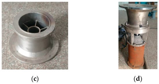 Experimental scheme and the tested pump: (a) experimental scheme; (b) impeller; (c) guide vane; (d) pump.